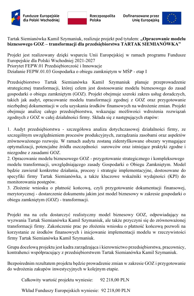 Przedsiębiorstwo Tartak Siemianówka Kamil Szymaniuk zrealizowało projekt pn. „Specjalistyczna usługa doradcza w postaci opracowania Biznes Planu nowego przedsięwzięcia dla Tartaku Siemianówka” (projekt nr RPPD.01.04.01-20-2546/20) z Regionalnego Programu Operacyjnego Województwa Podlaskiego na lata 2014-2020 w ramach Poddziałania 1.4.1 „Promocja przedsiębiorczości oraz podniesienie atrakcyjności inwestycyjnej województwa”.